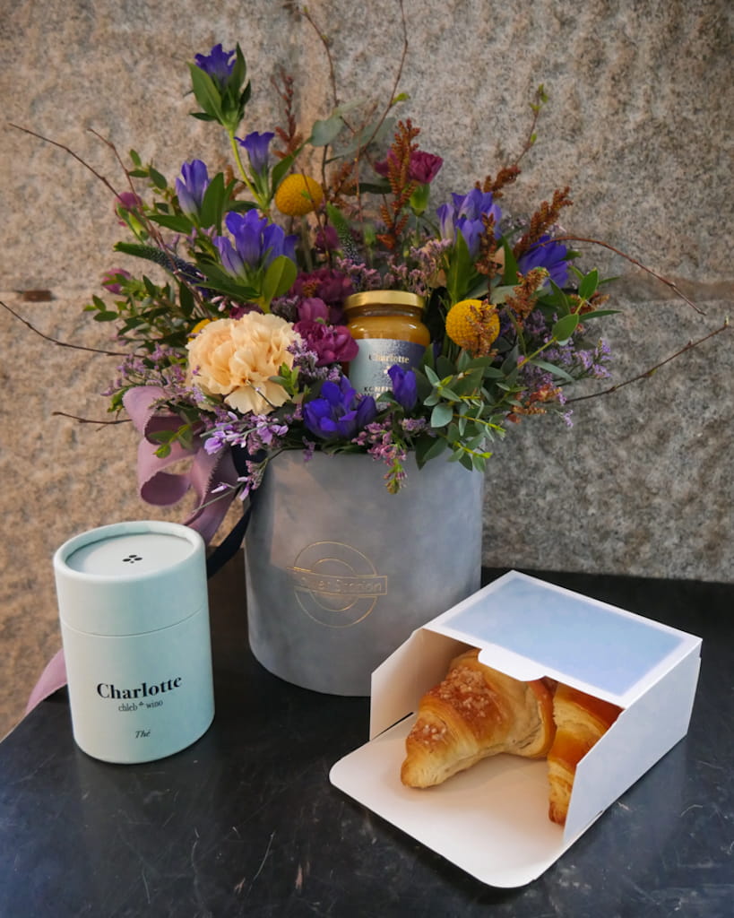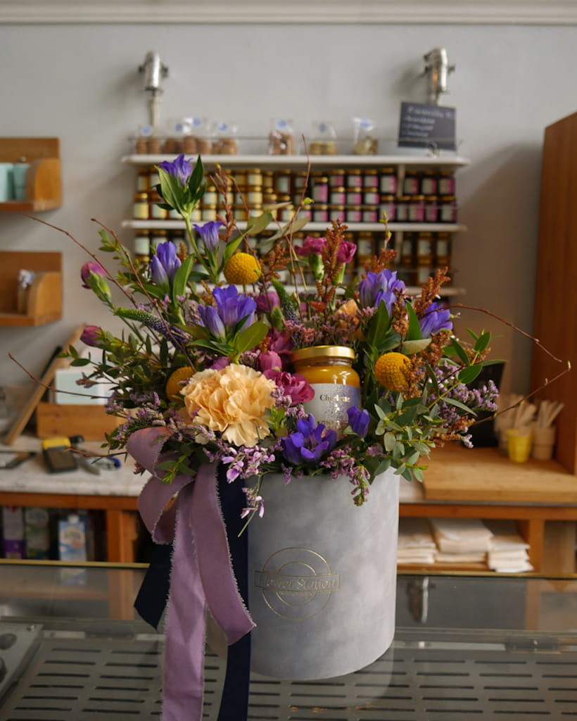 Elegancki flower box, powstały we współpracy z Bistro Charlotte - połączenie pięknych kwiatów i smakowitej konfitury z pomarańczy.
