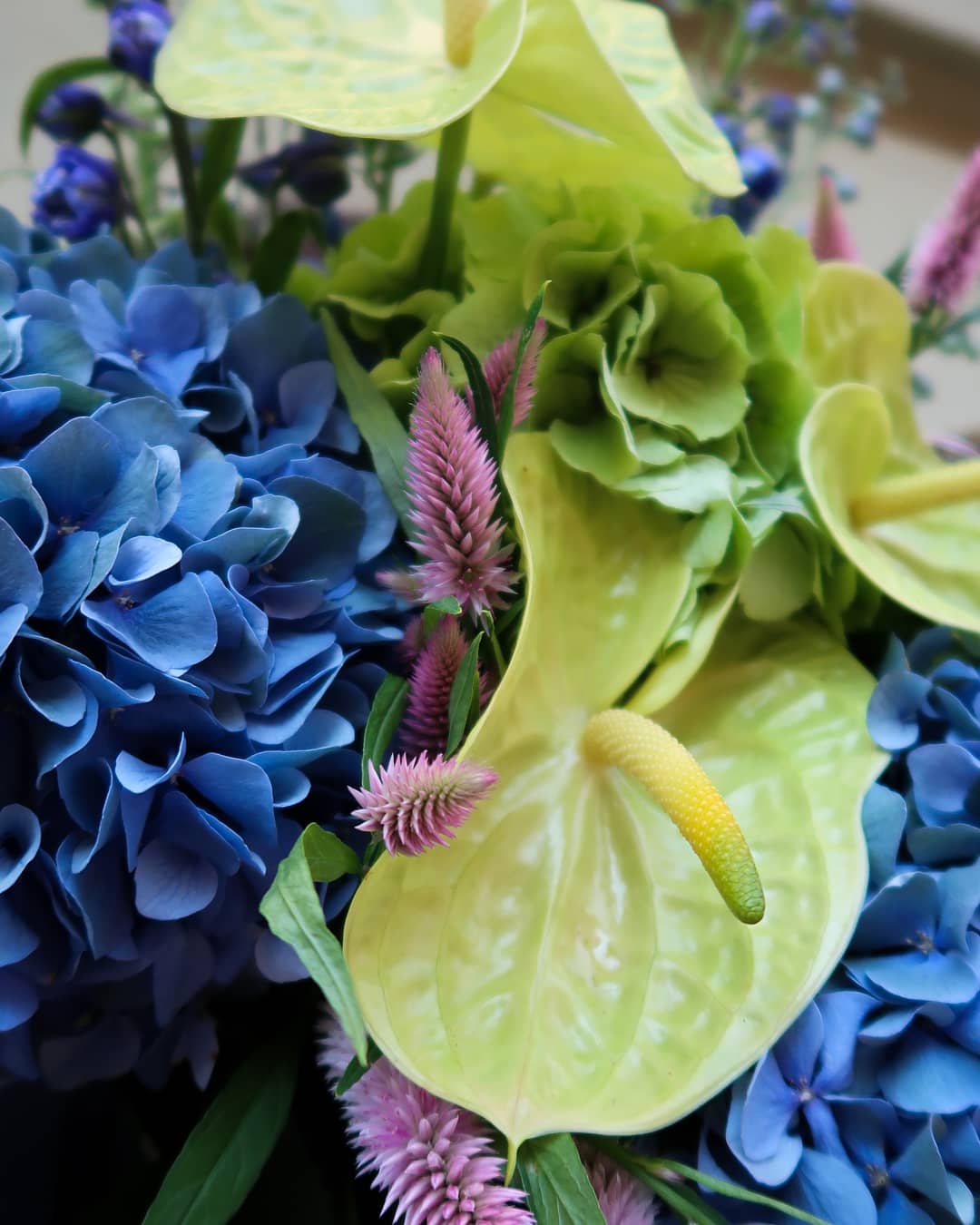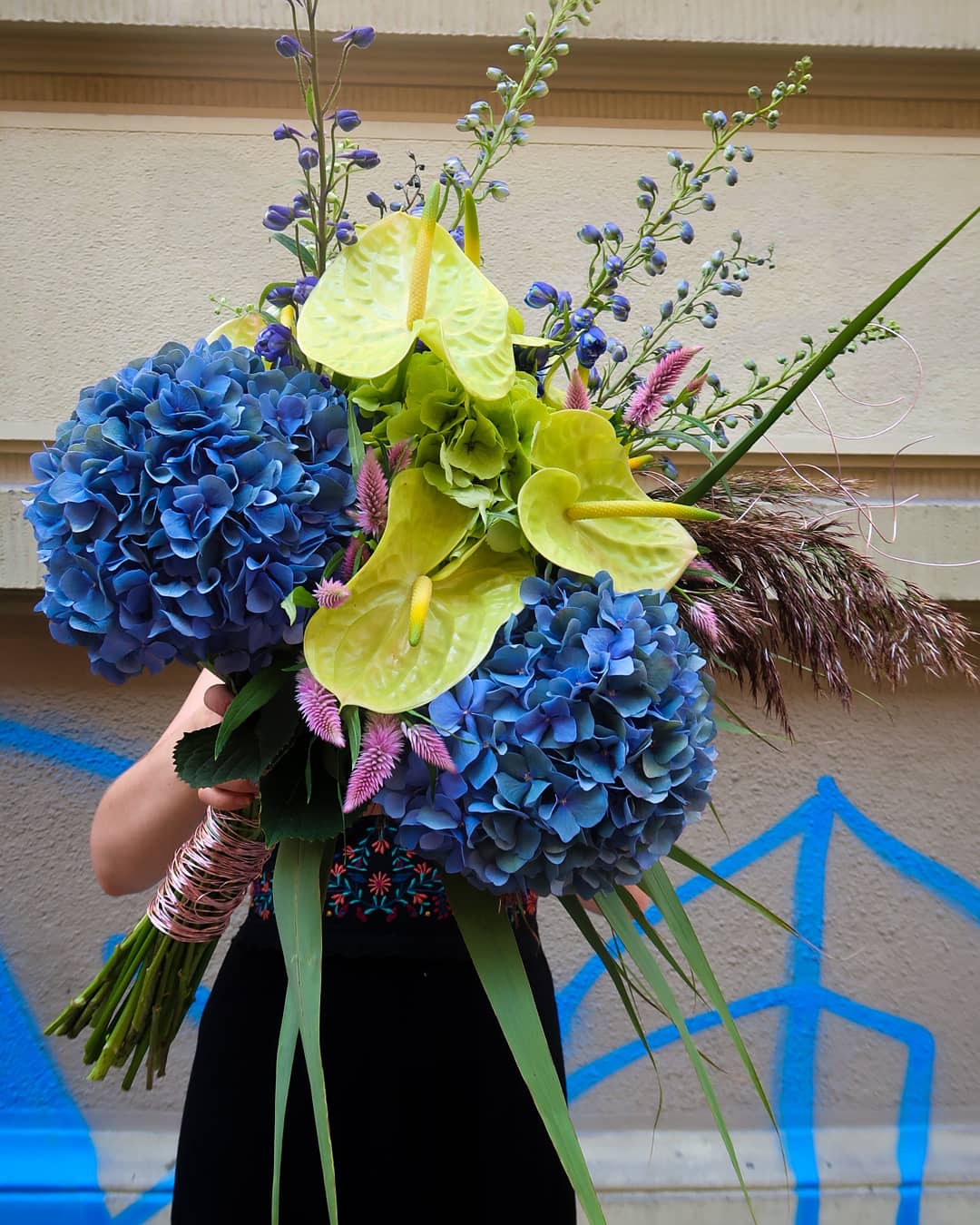 Awangardowy bukiet z anturium i hortensją w wyrazistych kolorach