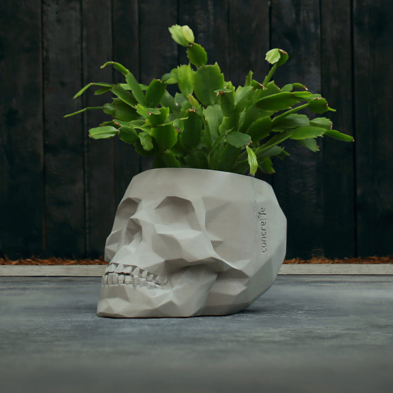 Osłonka czaszka, w kolorze szarym matowym, jest desingerskim dodatkiem do każdego wnętrza i rośliny. Jej kształt pasuje do różnych wnętrz. Osłonka w kształcie czaszki jest odważna i niespotykana - to zaskoczy każdego! Wykonana jest ręcznie, z wysokiej jakości betonu architektonicznego. Odporna na mróz i promienie UV.