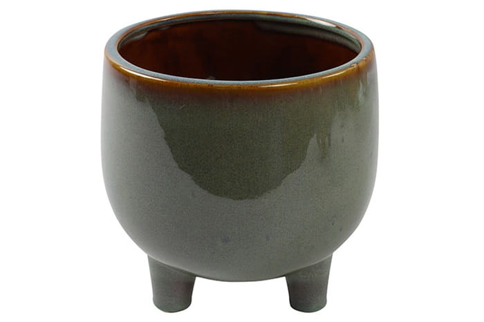 Osłonka ceramiczna, turkusowa, z efektem nakrapiania i obwódką u góry w kolorze ciemnopomarańczowym. Ma kształt lekko zaokrąglony. Ciekawym elementem osłonki są niskie nóżki, na których stoi.