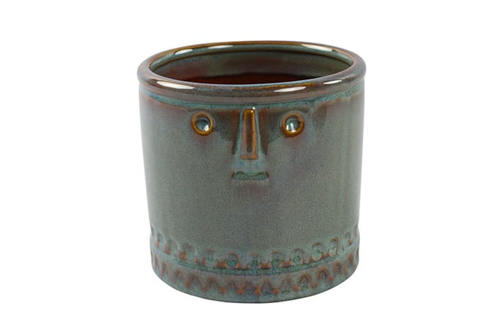Osłonka ceramiczna w intensywnym kolorze turkusowym z ciemniejszymi przetarciami. Ciekawym elementem osłonki są ozdobne tłuczenia i wytłoczona, zabawna twarz.