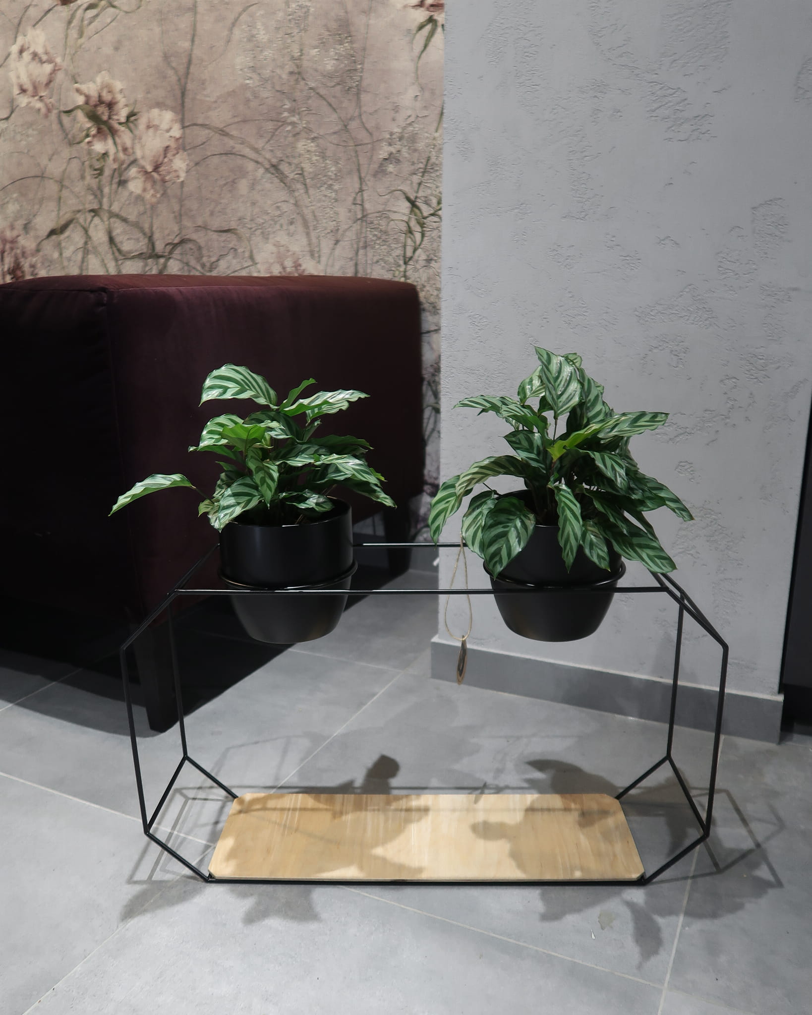 Stojak geometryczny na rośliny doniczkowe z metalu w kolorze czarnym jest elegancką ozdobą wnętrza i praktycznym kwietnikiem. Kształt stojaka przyciąga wzrok oryginalnością, ale i prostotą. Sprawdzi się zarówno we wnętrzu minimalistycznym, jak i w stylu urban jungle.
