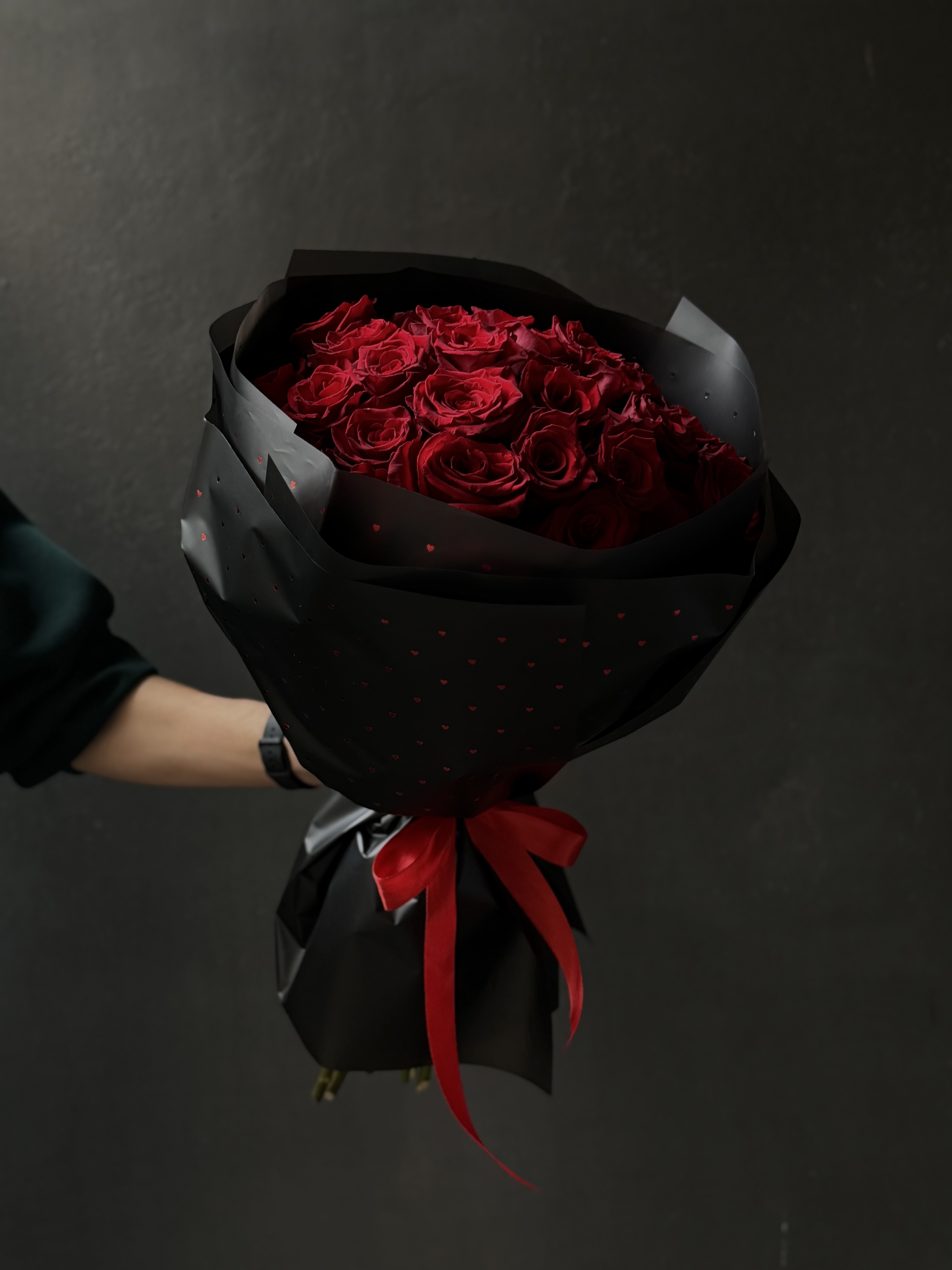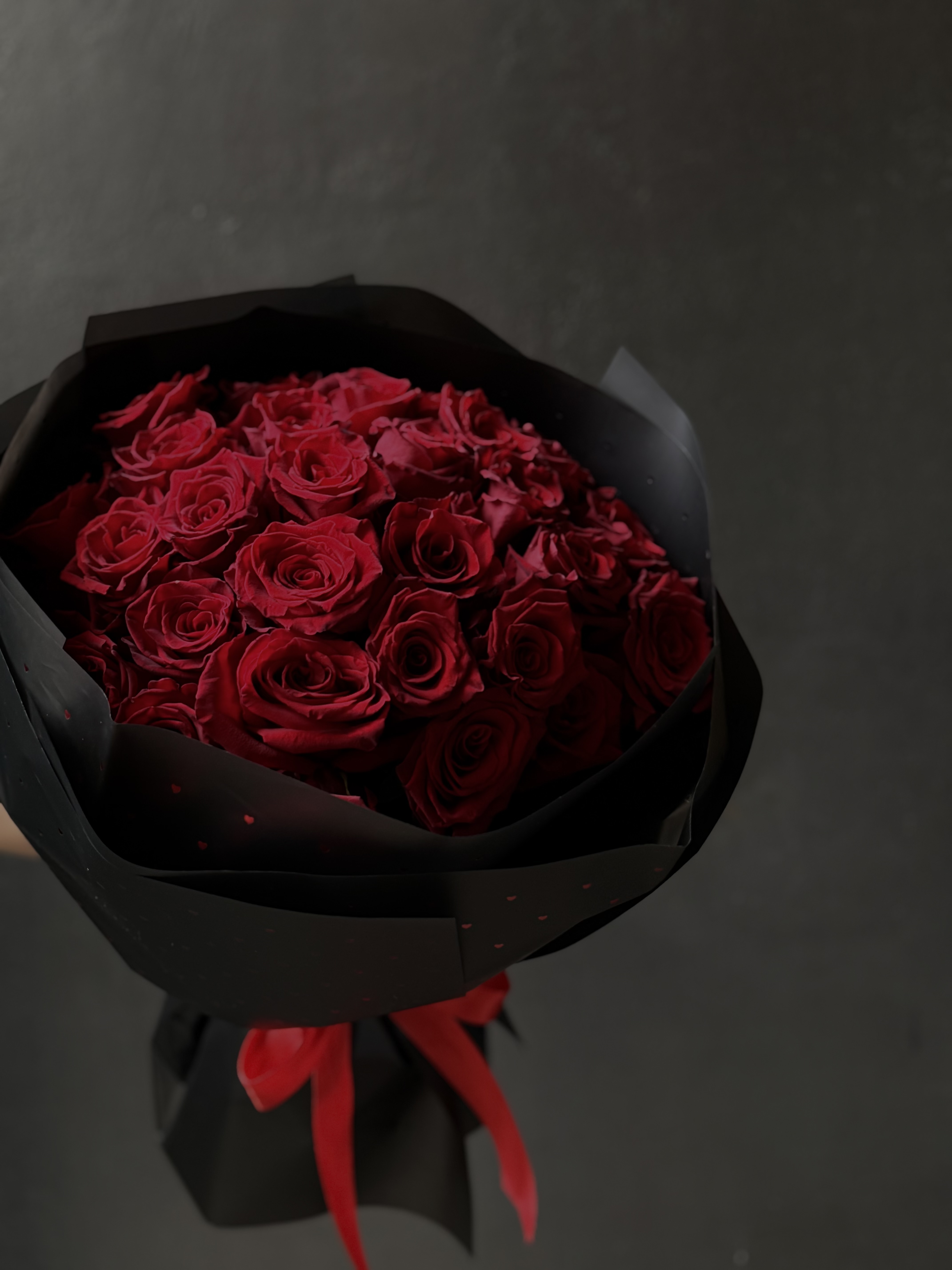 Elegancki bukiet z 30 czerwonych róż, starannie zapakowany w stylowy czarny papier. Klasyczne połączenie głębokiej czerwieni i czerni tworzy wyjątkowo szykowną kompozycję !