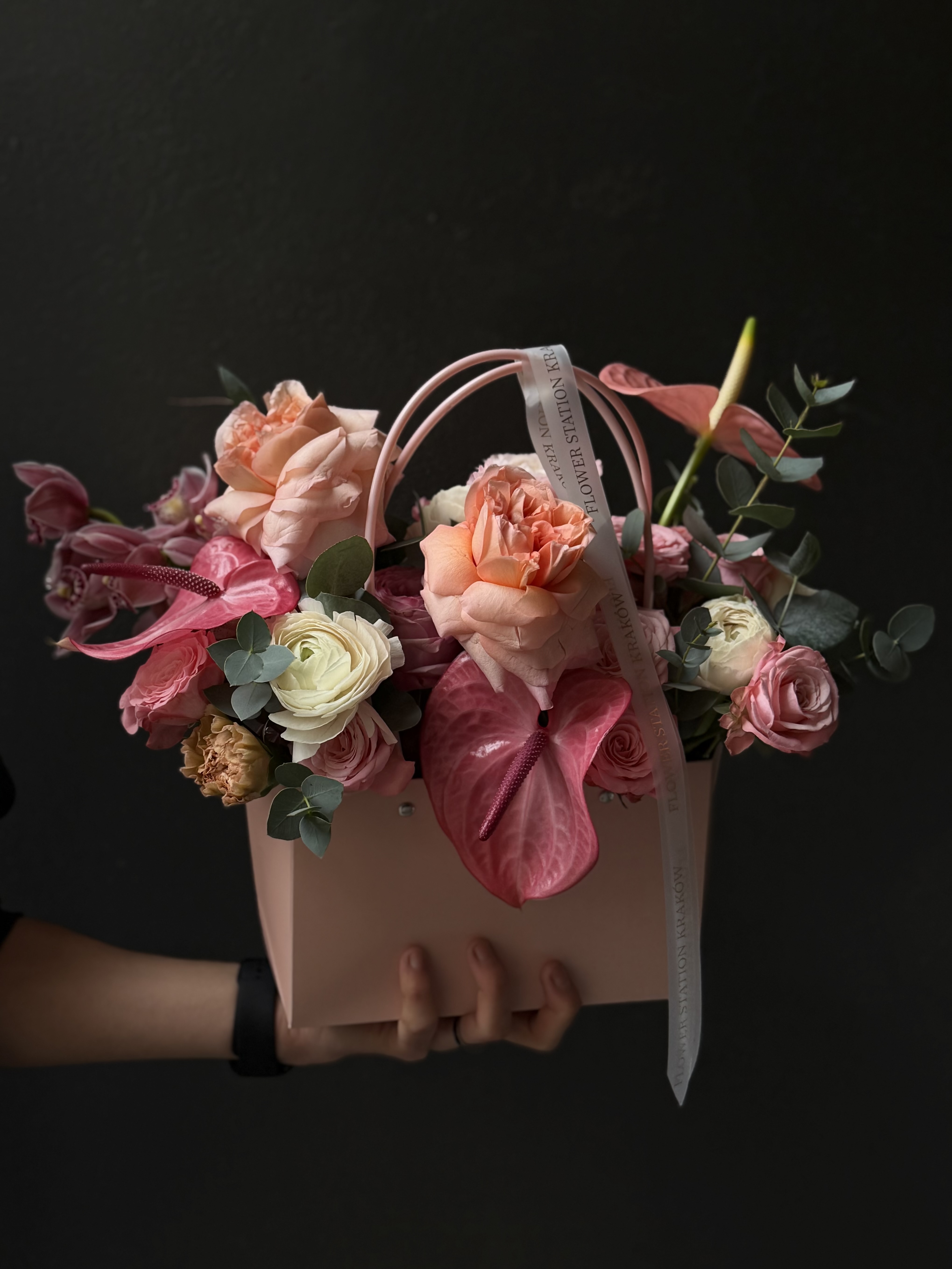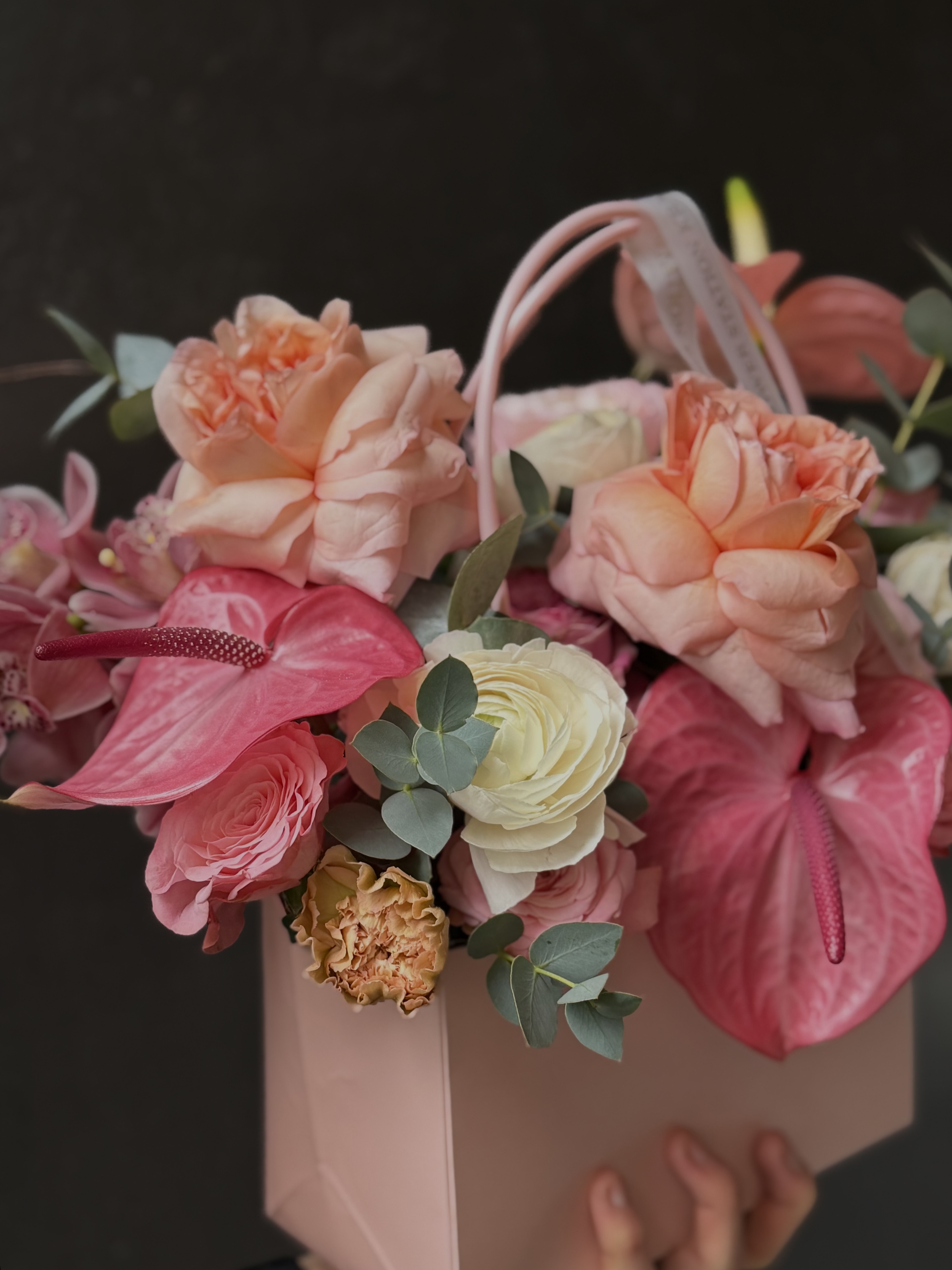 Miłość w Pudełku to wyjątkowy box kwiatowy utrzymany w harmonijnych odcieniach różu, który zachwyca elegancją i romantycznym charakterem. Kompozycję tworzą delikatny storczyk, efektowne różowe anturium oraz subtelne, gałązkowe róże, uzupełnione świeżym eukaliptusem dodającym lekkości i naturalnego uroku. Całość tworzy stylowy, pełen ciepła prezent – idealny, by wyrazić uczucia, podkreślić ważną chwilę lub sprawić bliskiej osobie wyjątkową radość.